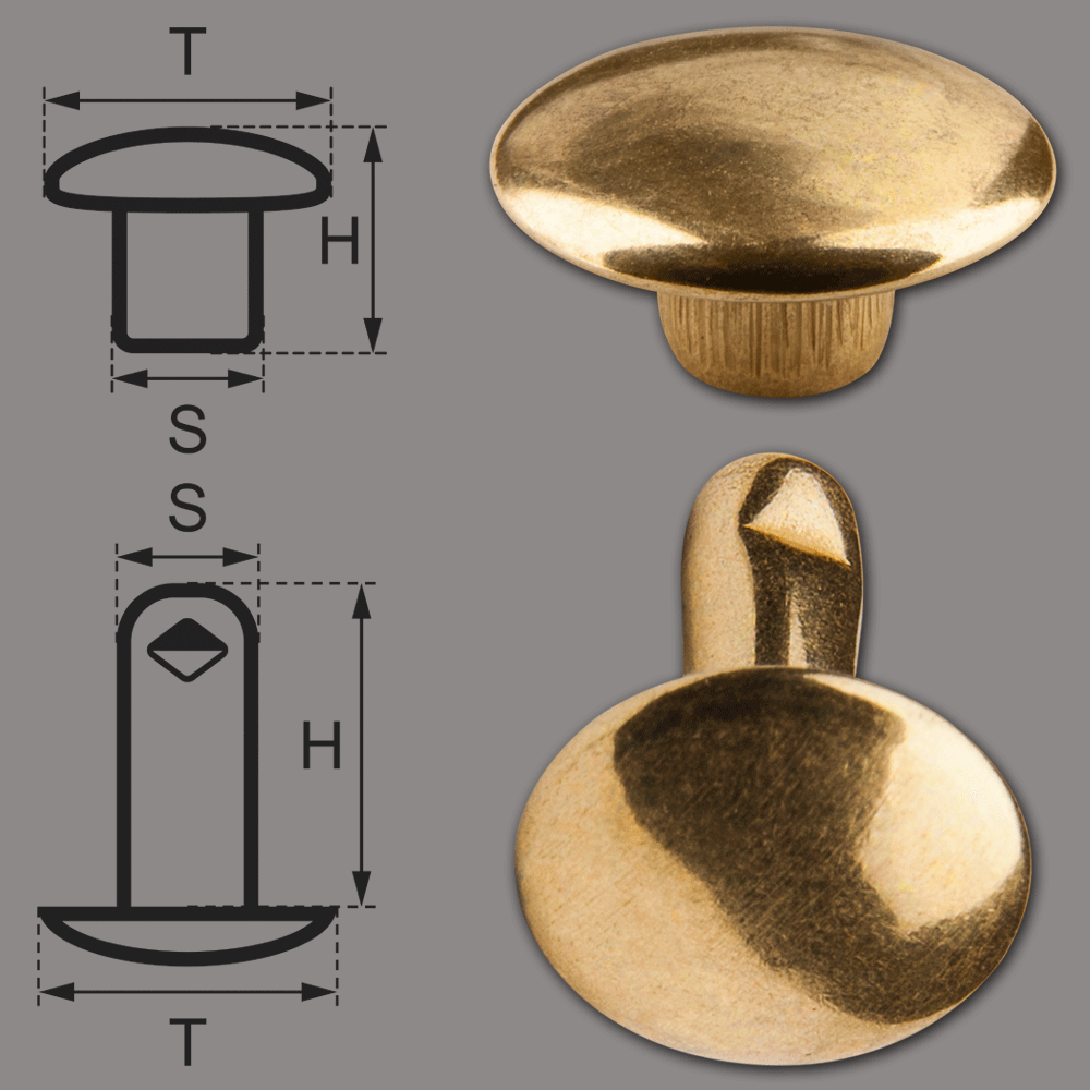 Doppelkopf-Hohlnieten Ziernieten 2-teilig 9mm "9/10/2" aus Eisen (nickelfrei), Finish: messing-glänzend (goldfarben)