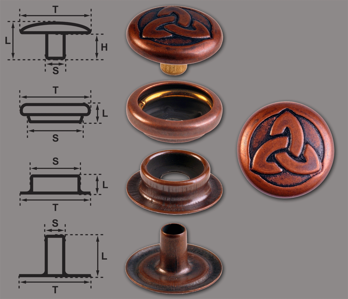 Ringfeder-Druckknöpfe “F3” 14mm Keltische Trinity aus Messing (nickel frei), Finish: kupfer-antik
