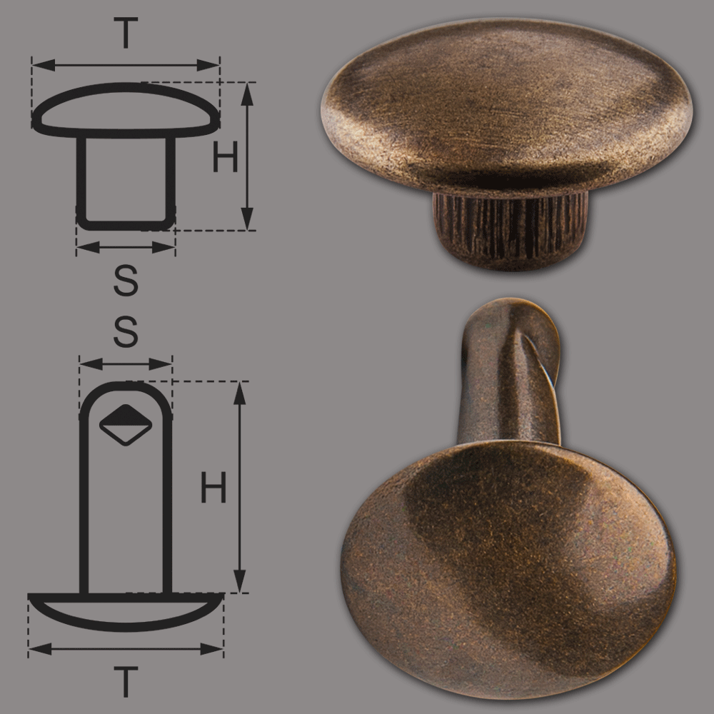 Doppelkopf-Hohlnieten Ziernieten 2-teilig 7mm "7/8/2" aus Eisen (nickelfrei), Finish: messing-antik