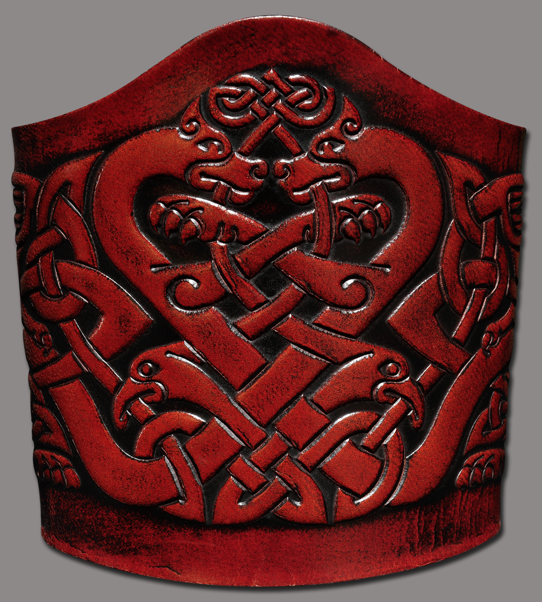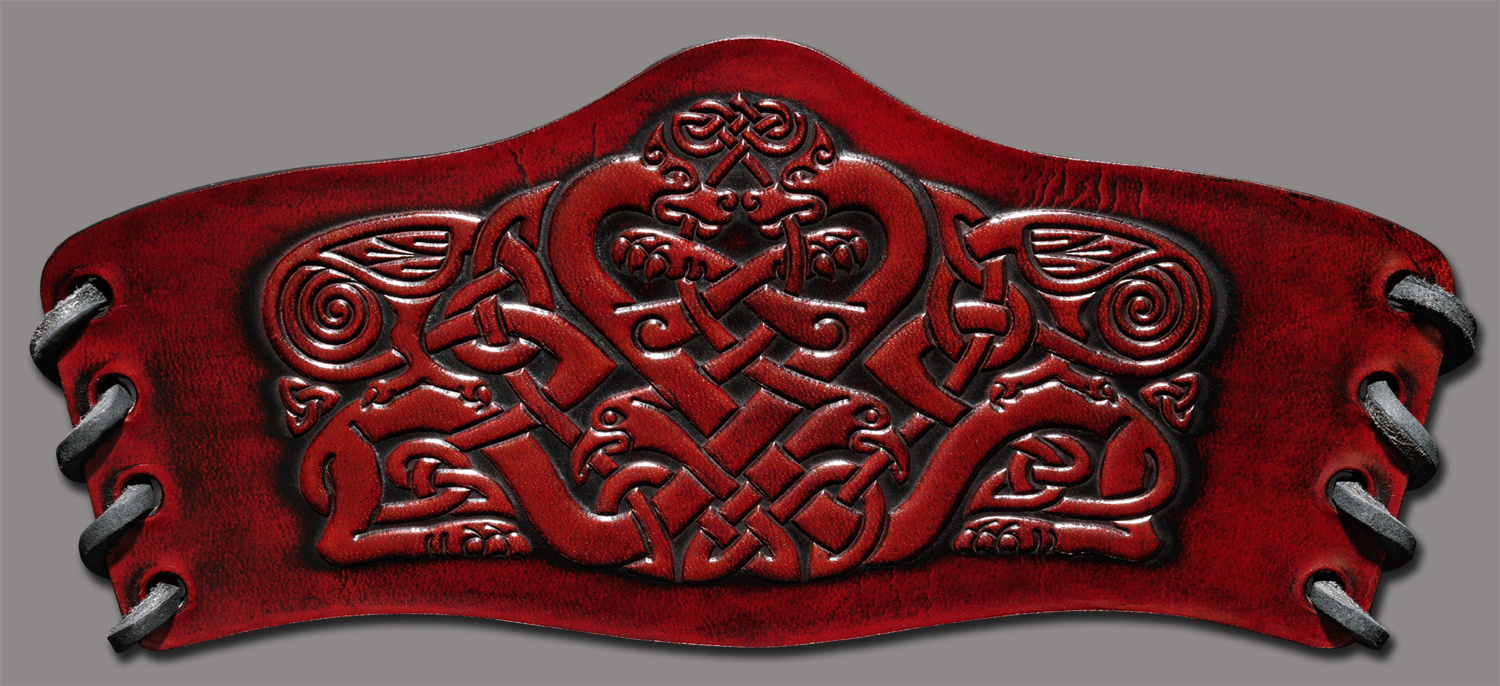 Geprägtes, kräftiges Lederarmband aus Vollrindleder zum binden. Das Armband hat eine unregelmäßige Form, wodurch es trotz seiner Breite ein hohes Maß an Tragekomfort bietet. Die angegebene Länge bezieht sich auf die kürzere Seite (unten) des Armbands. Diese Armbänder sind in vier Größen erhältlich, wobei diese durch den Riemenverschluß zusätzlich verstellbar sind.