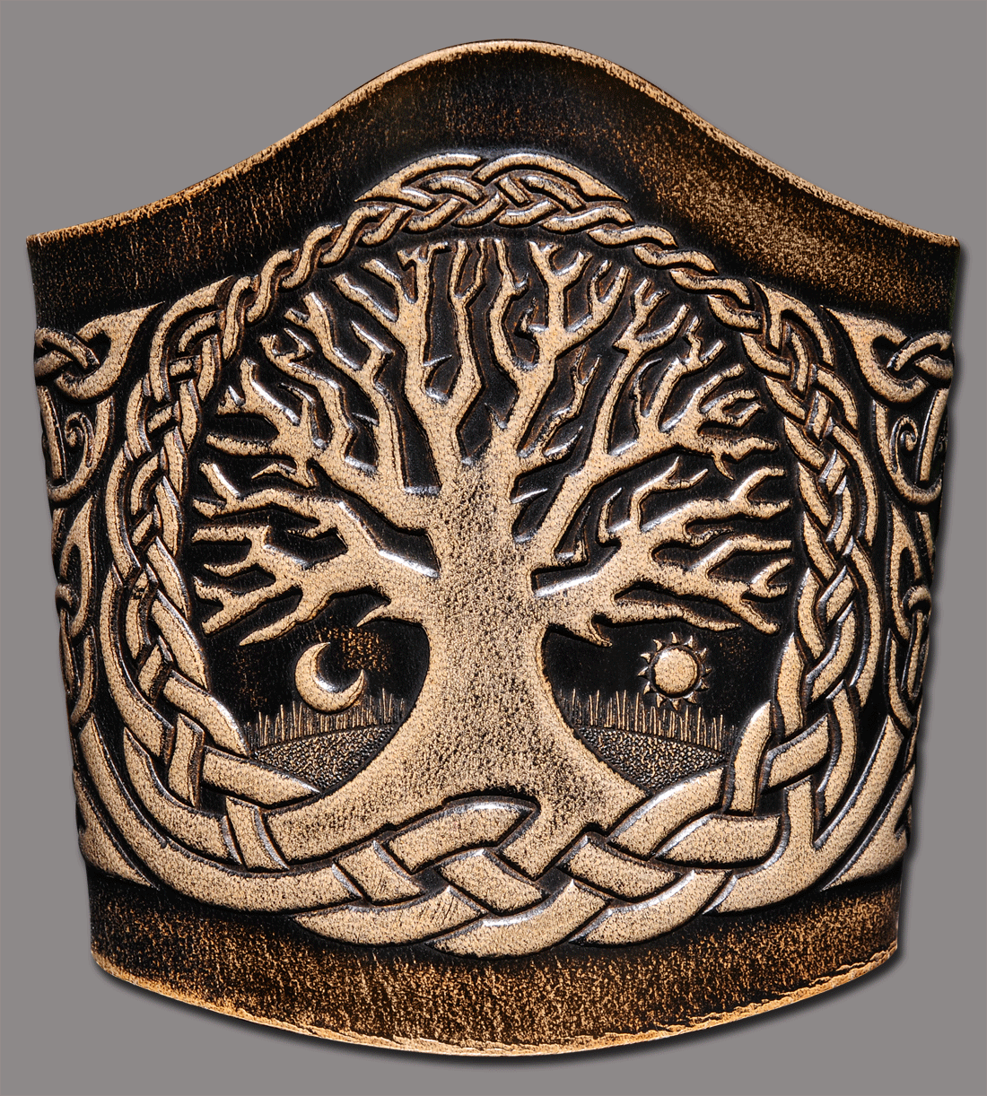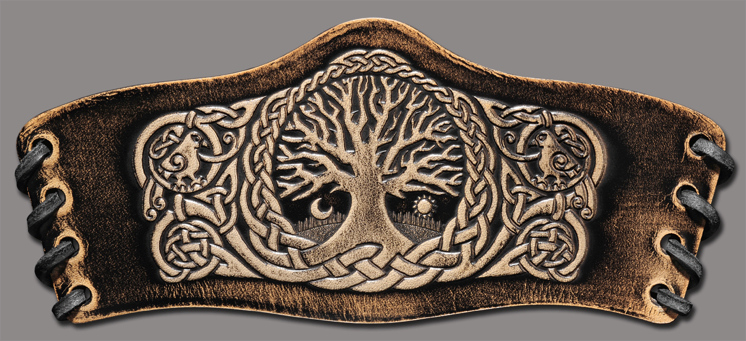 Geprägtes, kräftiges Lederarmband aus Vollrindleder zum binden. Das Armband hat eine unregelmäßige Form, wodurch es trotz seiner Breite ein hohes Maß an Tragekomfort bietet. Die angegebene Länge bezieht sich auf die kürzere Seite (unten) des Armbands. Diese Armbänder sind in vier Größen erhältlich, wobei diese durch den Riemenverschluß zusätzlich verstellbar sind.